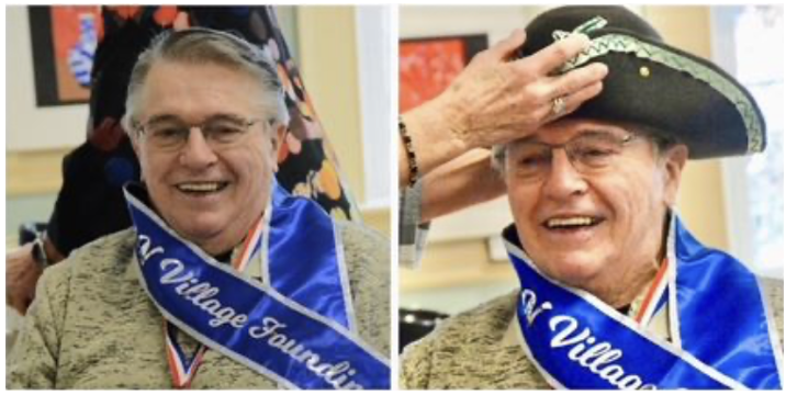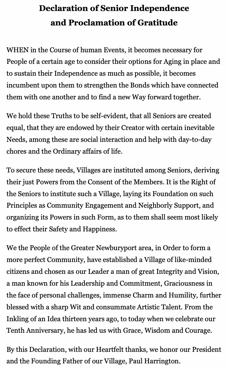 On March 7, the Village celebrated 10 years of volunteers providing services and members sharing social events. Our Founding Father, Paul Harrington, has been at the helm through it all and even several years previously as the work for setting up the Village was done. For your enjoyment, we share photos of Paul in his Village regalia and the declaration created by Kitty Krajci that she read to those at the celebration.